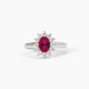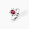 Anello da donna regolabile in argento rodiato con rubino sintetico taglio ovale e zirconi bianchi.