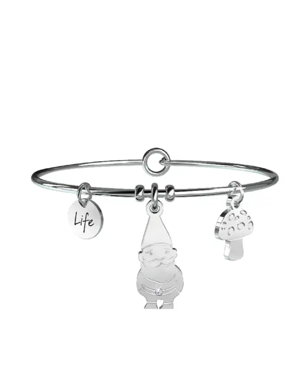 Bracciale rigido della collezione Kidult Nature da donna. Bangle in acciaio inossidabile 316L con ciondolo a forma di fungo e di gnomo. Il ciondolo a forma di gnomo presenta un cristallo al centro. Misura unica: diametro 6 cm, con chiusura tonda. Designed by Kidult in Italy.