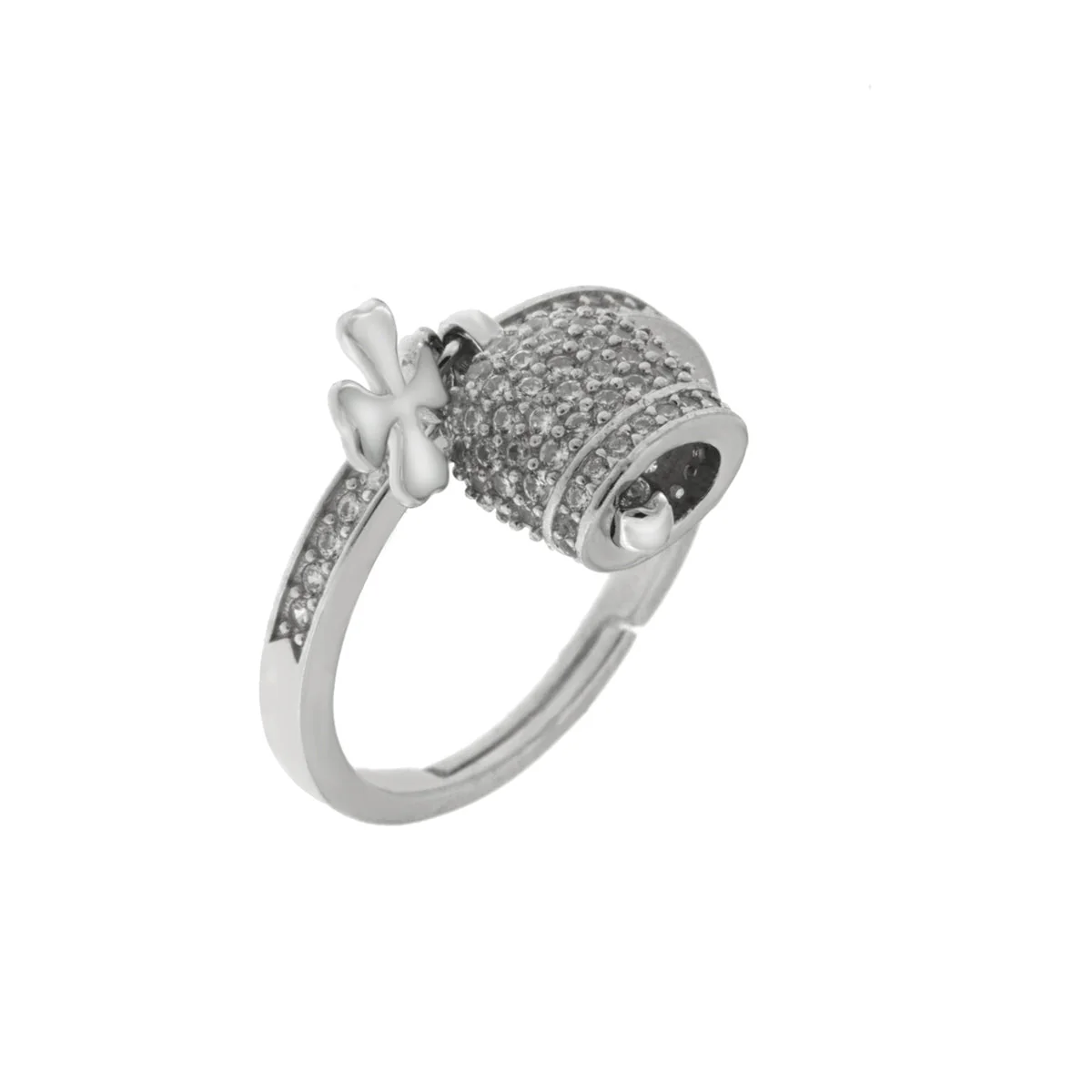 Anello in Argento 925 con campanella portafortuna e quadrifoglio impreziositi da cubic zirconi
