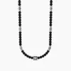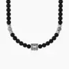 Collana Kidult per Uomo con pietre agata nera e agata grigia naturali alternate a dischetti in acciaio lucido. Al centro un elemento in acciaio con sfondo nero e trama a righe con scritta “MY FAMILY” (= la mia famiglia).