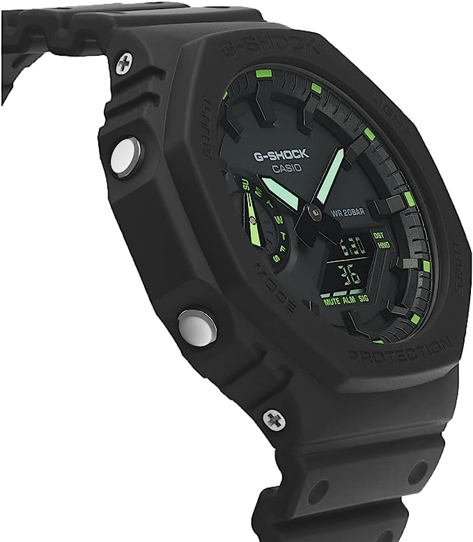Orologio multifunzione da uomo di G-Shock. Orologio con cassa in resina grigio scuro ottagonale di diametro 45,4 mm, display analogico-digitale, e fibbia in in resina di colore grigio scuro. La resistenza all’acqua e’ 20atm. Il movimento è al quarzo. Le funzioni sono: luce led, antiurto, neobrite, funzione ora mondiale, cronometro – 1/100 sec – 24 ore, timer – 1/1 sec. – 24 ore, 5 allarmi giornalieri, attivazione/disattivazione del suono dei tasti, funzione di spostamento delle lancette, calendario automatico, formato 12/24 ore. Vetro minerale, cinturino in resina, 3 anni – 1 batteria. La referenza è: ga-2100-1a3er
